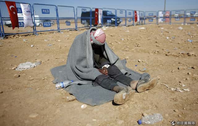 100歲的庫德族人歐斯曼(Mohammad Osman),他的身上滿是塵土,累倒地坐在地上,他從敘利亞家園逃出後,一路來到土耳其邊境,照片中的他正等待能進入土耳其避難的時刻。