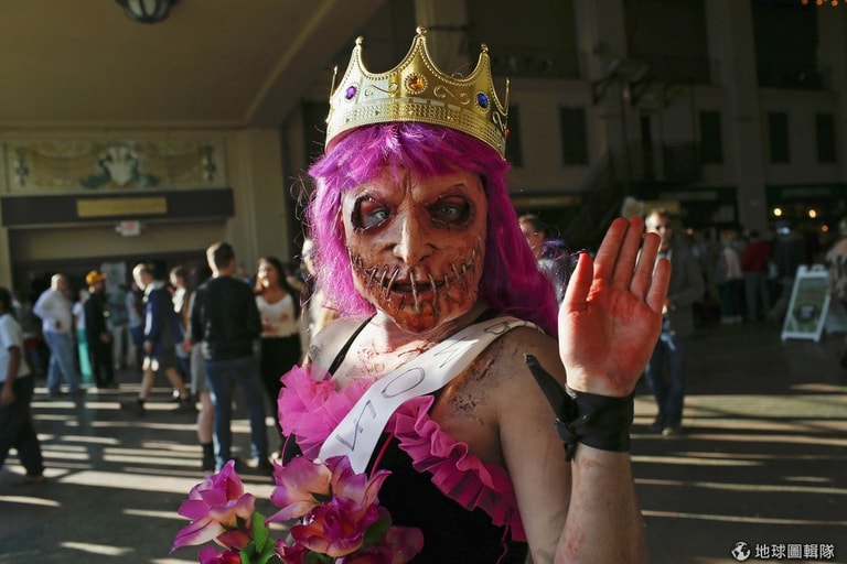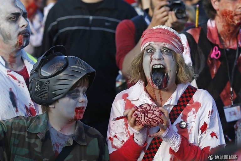 原來,這是紐澤西已經舉辦數次的「殭屍遊行」(Zombie Walk)活動,今年參加居民想再度挑戰打破世界紀錄外,主辦單位也表示2014年的殭屍活動是要喚起世人對腦癌的注意。