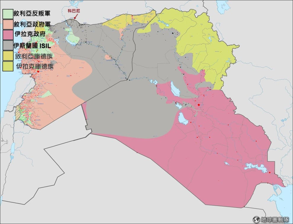 圖中紅色箭頭指的就是這次受到伊斯蘭國聖戰士夾擊的科巴尼(圖上目前仍標為敘利亞庫德族掌控),它就位在敘利亞和土耳其的邊境上,一旦伊斯蘭國拿下此區,也等於掌控了敘土邊境一帶。 Photo credit: wikicommons