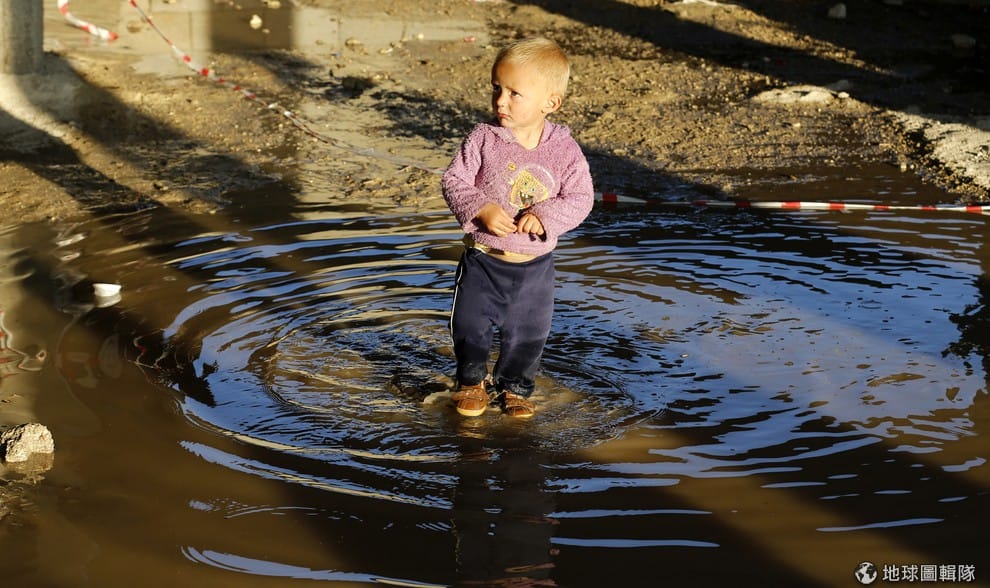 一位庫德族小朋友和家人逃到蘇魯奇的營區避難。