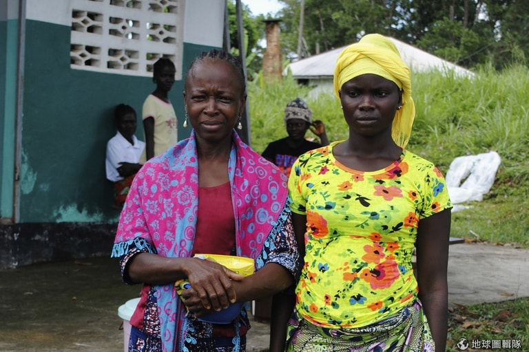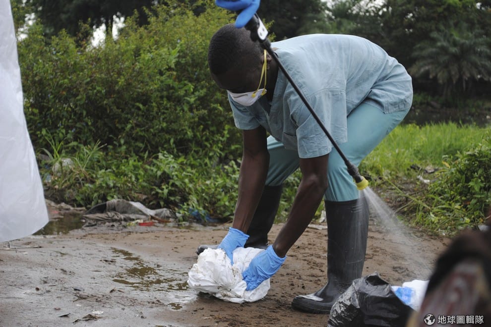 西非賴比瑞亞當地的醫療人員正在防護衣脫下,他的夥伴在一旁噴灑消毒用的氯