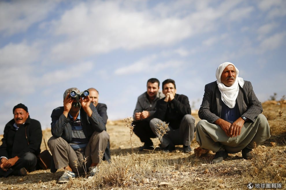 在土耳其當地的庫德族人坐在山丘上,看著敘利亞境內的族人對抗伊斯蘭國進展