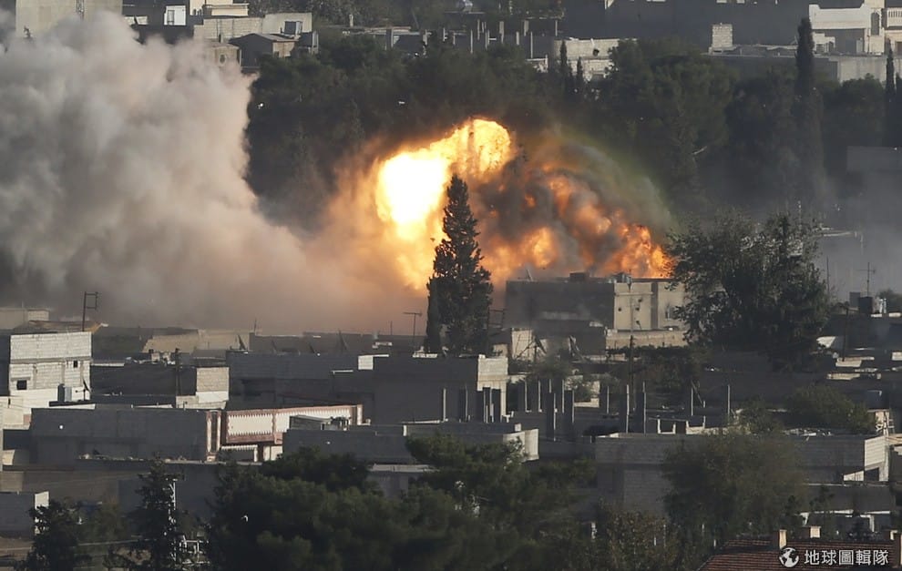 科巴尼市在美軍的援助下不斷出現被空襲的景象,美國領軍的轟炸行動要遏止伊斯蘭國繼續佔領科巴尼