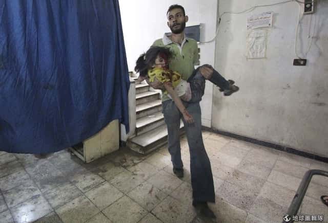 民眾緊急抱著受戰火波及的女孩衝進醫院。他們所住的地方遭到政府軍轟炸。