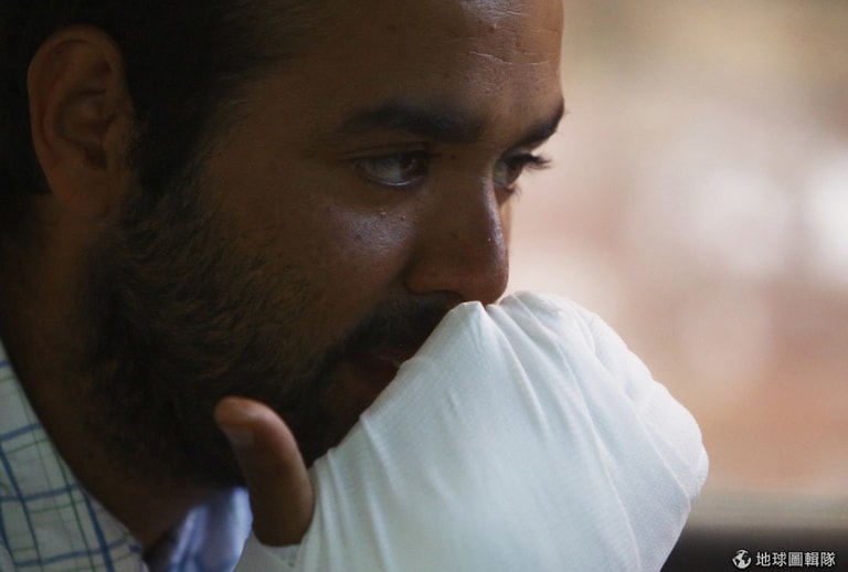 以色列籍的登山客因為凍傷手上包起厚重的紗布,他正等待回家的車輛