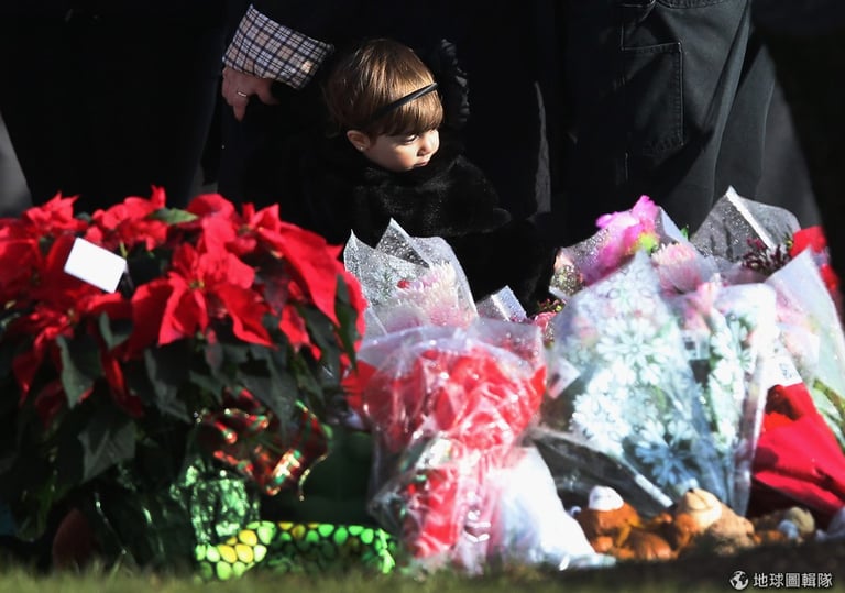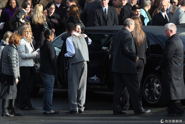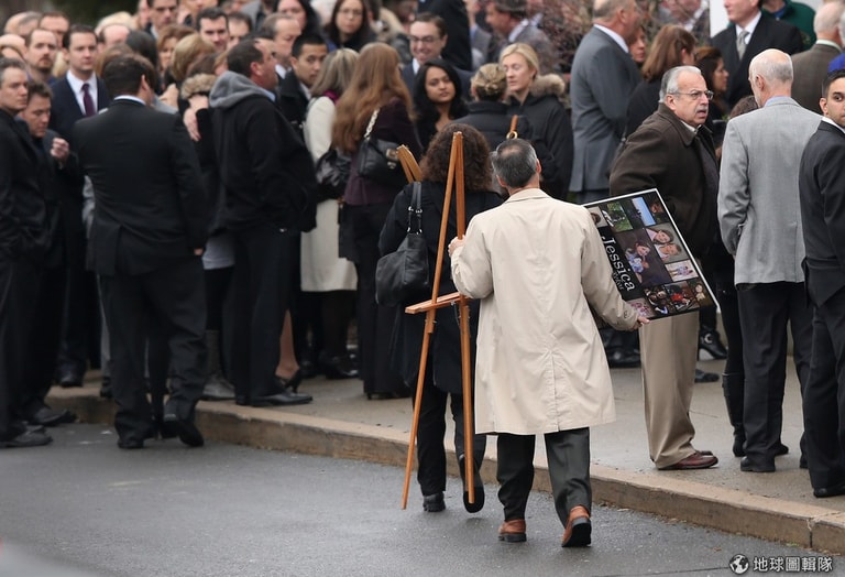 年僅6歲的潔西卡(Jessica Rekos),她的父母在進入教堂前忍不住悲痛大哭,一旁的親友緊緊抱住潔西卡的母親,給她最大的安慰和力量。目前,山迪胡克小學因為仍被列為犯罪現場,小學生都先移到附近鎮上的空校舍上課,等待警方調查結束後,學生們才能再回到原校舍。