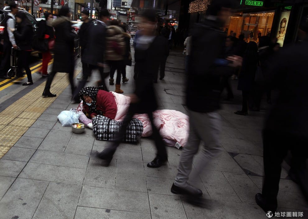 乞丐躺在香港街頭,香港是目前亞洲貧富差距最大的地方之一。