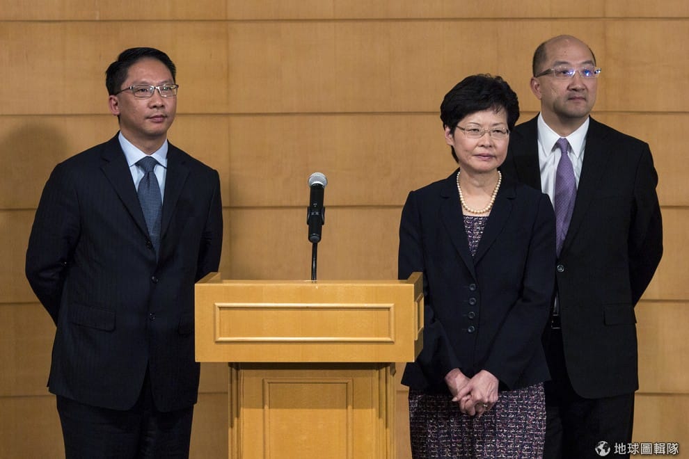 照片由左至右分別是香港律政司司長袁國強、政務司司長林鄭月娥、香港政制及內地事務局局長譚志源。