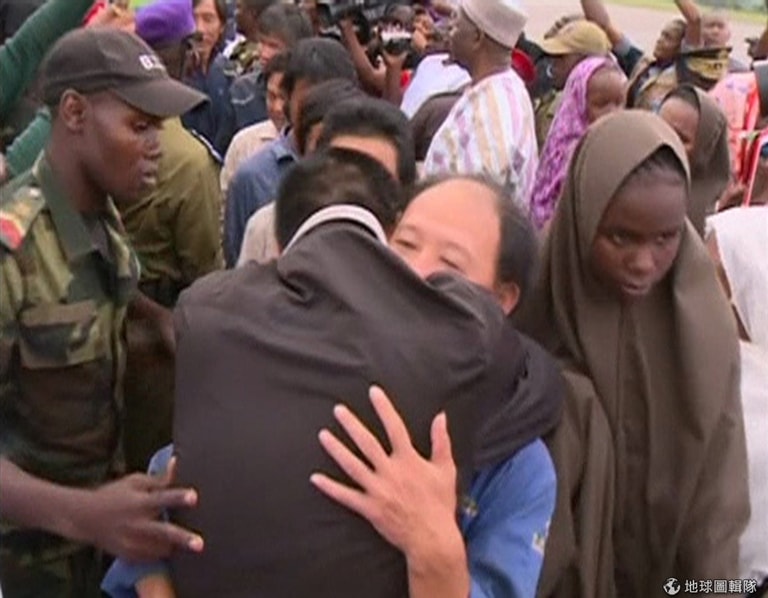 照片是日前10月11日時,喀麥隆的雅溫德國際機場可見被恐怖組織博科聖地釋放回來的人質,其中一名中國籍人質與友人見面相擁。
