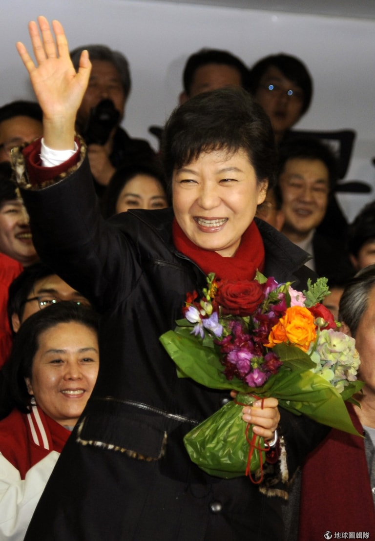 零下10度低溫中,朴槿惠在支持者的簇擁下發表當選感言。圖片來源:Chung Sung-Jun/Getty Images