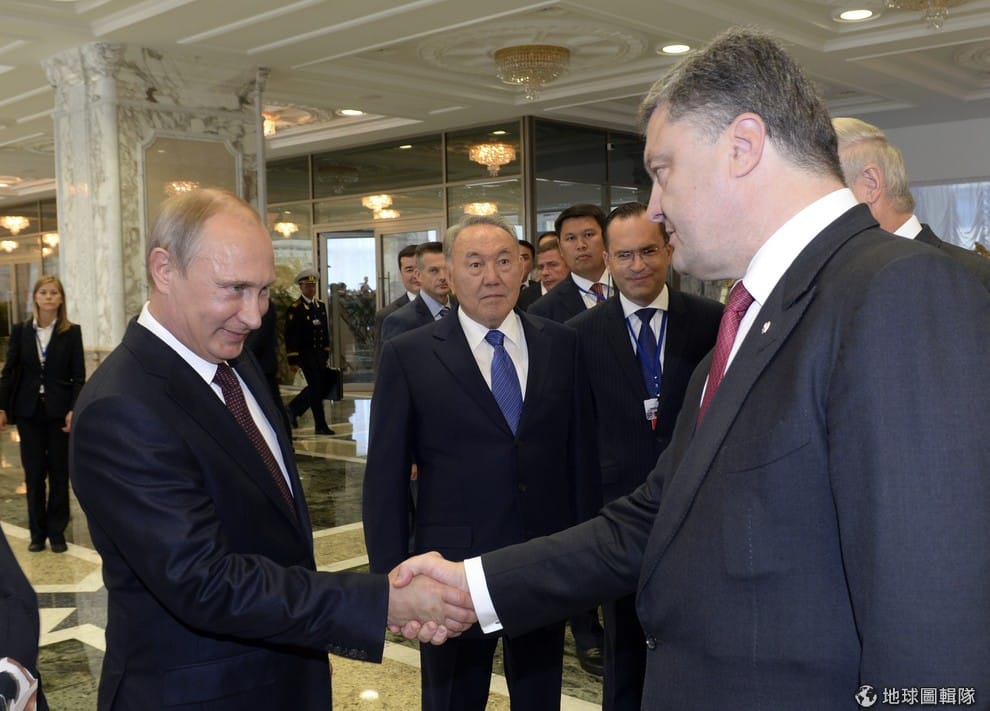 俄國總統普亭(左)與烏克蘭總統波洛申科互相握手。