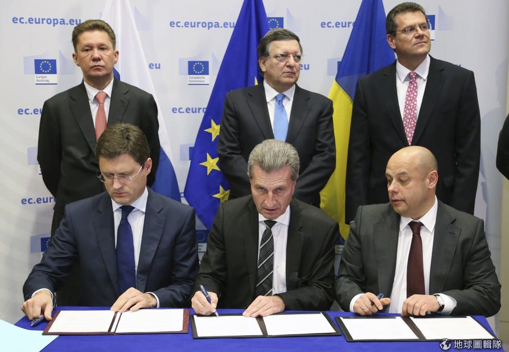 前方3人由左至右分別是俄國能源部長諾瓦克、歐盟能源執委厄廷格、烏克蘭能源部長波登(Yuri Prodan),他們正在簽訂天然氣合約。