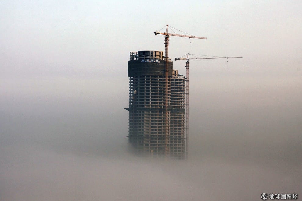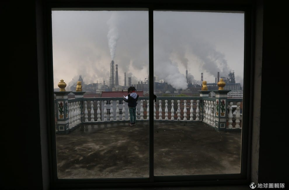中國浙江省當地,一位小女生站在自家陽台上念書,遠方可以看見工廠煙囪正不斷竄出灰煙。