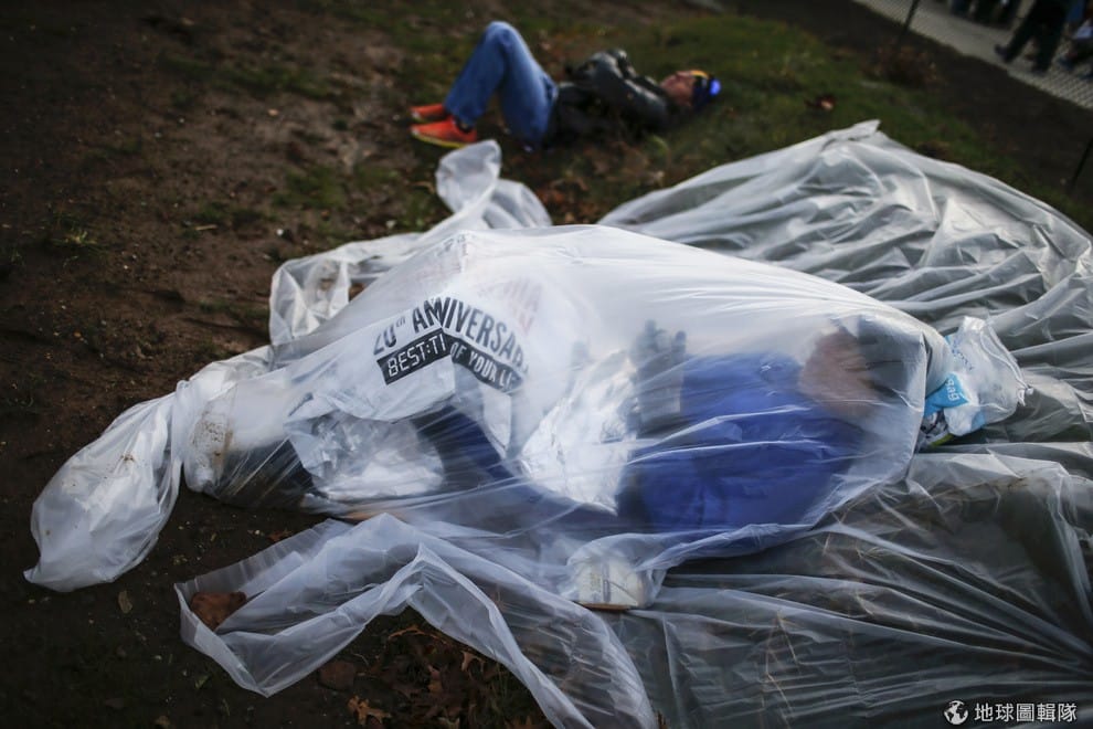 馬拉松跑者為了避寒取暖,把自己包在塑膠袋中。紐約即將舉行年度的紐約市馬拉松競賽,許多跑者紛紛齊聚當地。