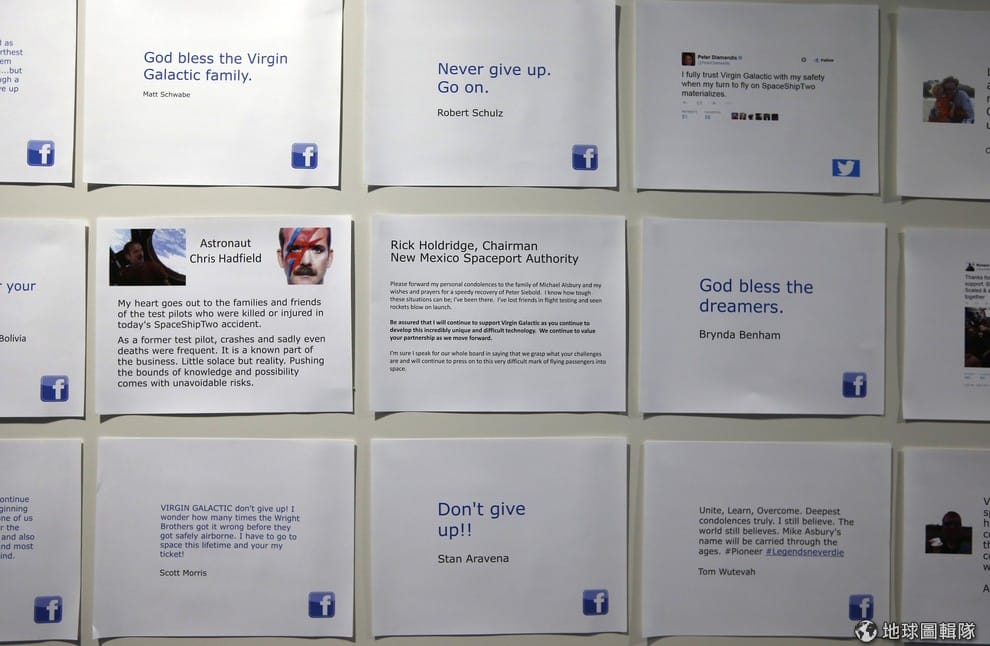 從臉書和推特上集結而成的留言貼滿牆,表達對維京太空船2號上的罹難駕駛員的哀悼。