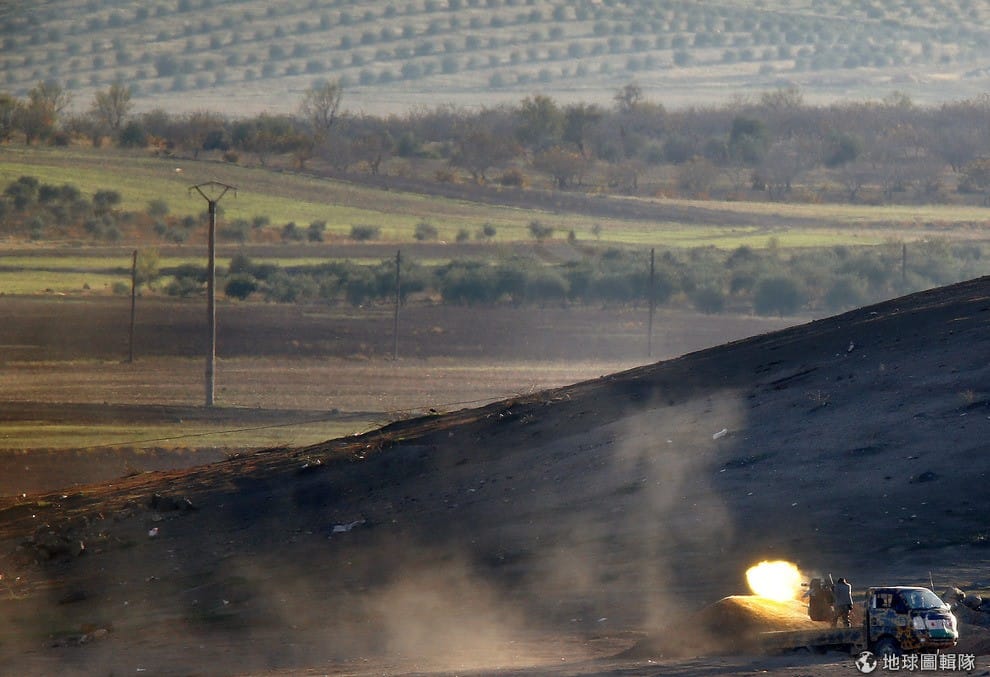遠眺邊境城市科巴尼,敘利亞人正對著遠處的伊斯蘭國聖戰士開槍。