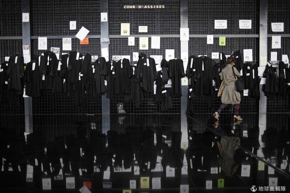 律師服掛滿牆面,日前4號時,法國南斯地區(Nantes)出現律師罷工的消息,當地律師不滿政府對律師執業的改革政策,於是在南斯當地的法院外將衣服高掛牆上表達不滿。