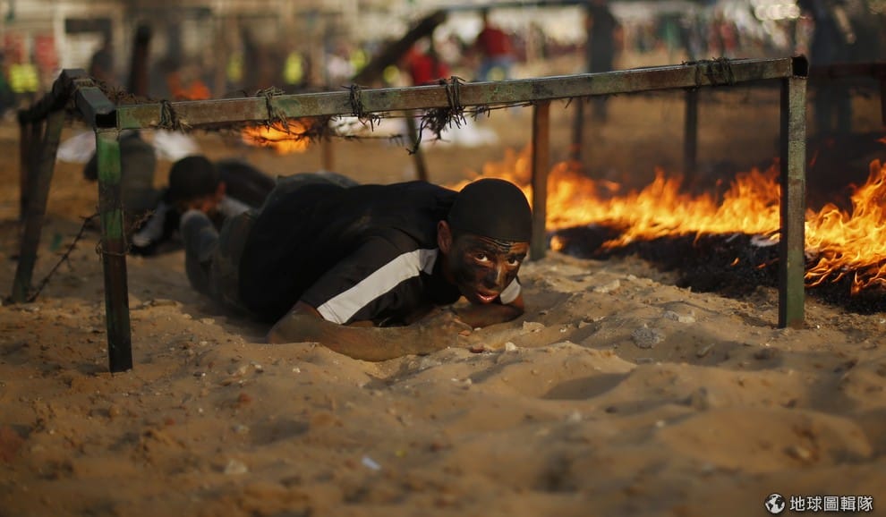 年輕巴勒斯坦人正匍匐爬過障礙,他和其他人從哈瑪斯的軍事夏令營「勝利之光」(Fajer Al-Entesar)結訓正在進行結訓儀式。