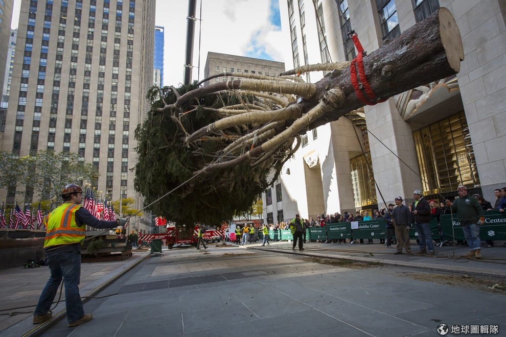 紐約的洛克斐勒中心前,人員正忙著把高達85英尺的聖誕樹運到定點。