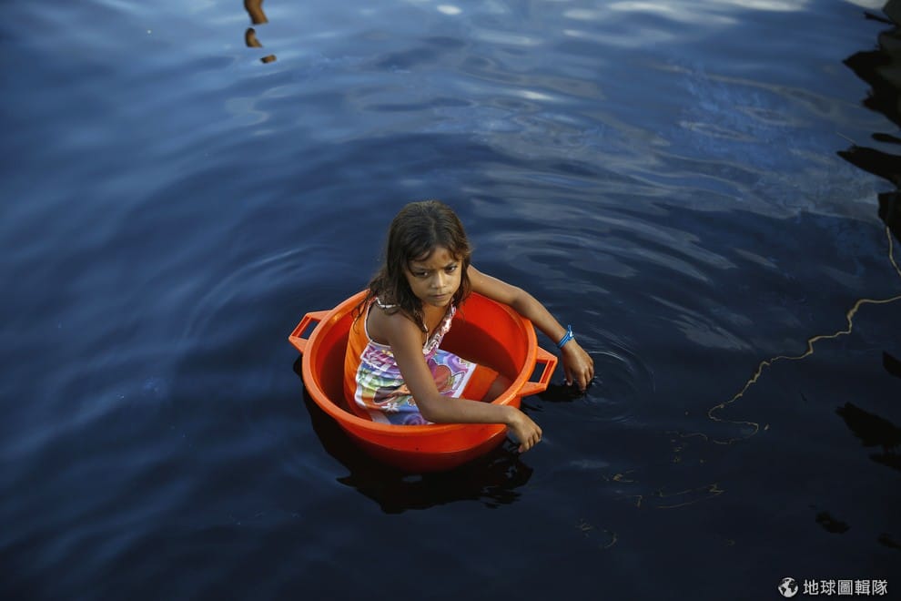 小女生坐在塑膠盆中,飄在卡塔通博河面上,這裡已經成為金氏世界紀錄中,發生最多閃電的地方。