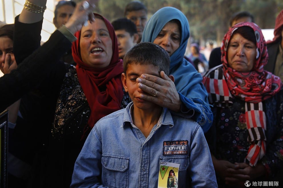 土耳其當地的敘利亞庫德族難民,他們站在醫院外悼念不幸戰死的同胞。