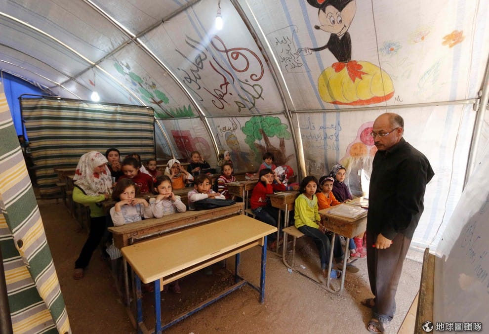 難民營區中的孩子們正在臨時帳篷中上課。
