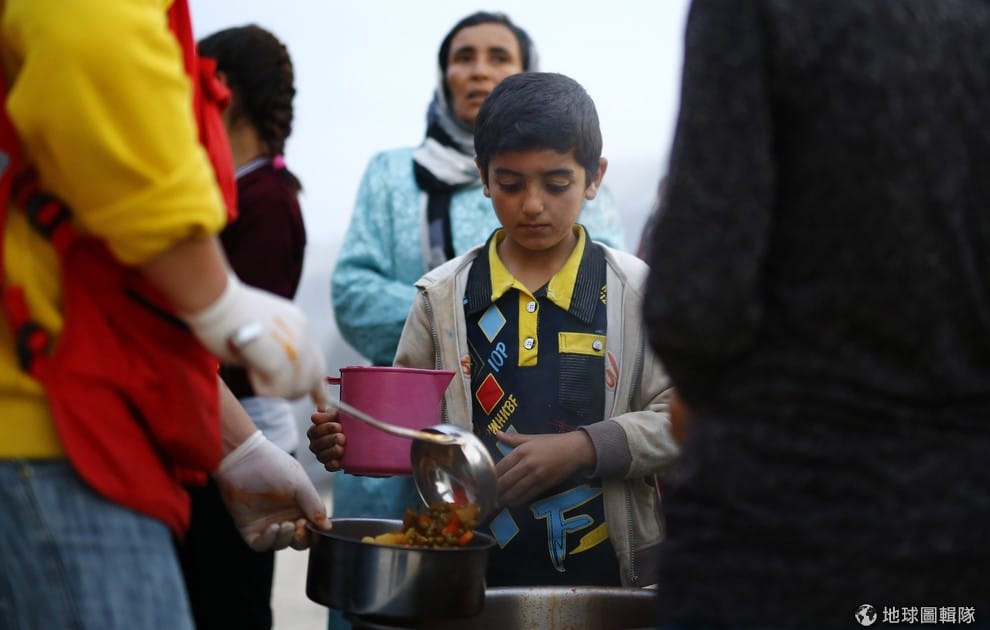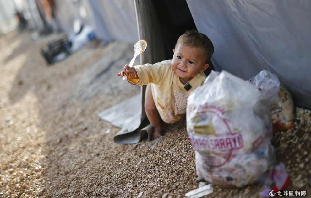 因為伊斯蘭國威脅,和家人一起從敘利亞邊境城市逃出的小男孩正在難民營中等食物發放