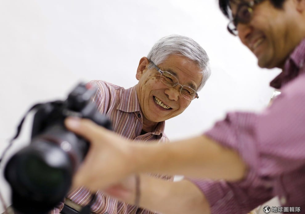 路透社一雄爺爺(Kazuo Furumoto)笑著看攝影師幫他拍的照片,這張照片將會用來放在「生命終結之旅」體驗活動裡的葬禮上。
