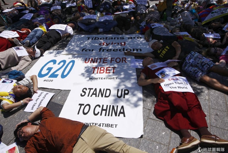 會場外可以見到抗議中國處理西藏人權議題的民眾
