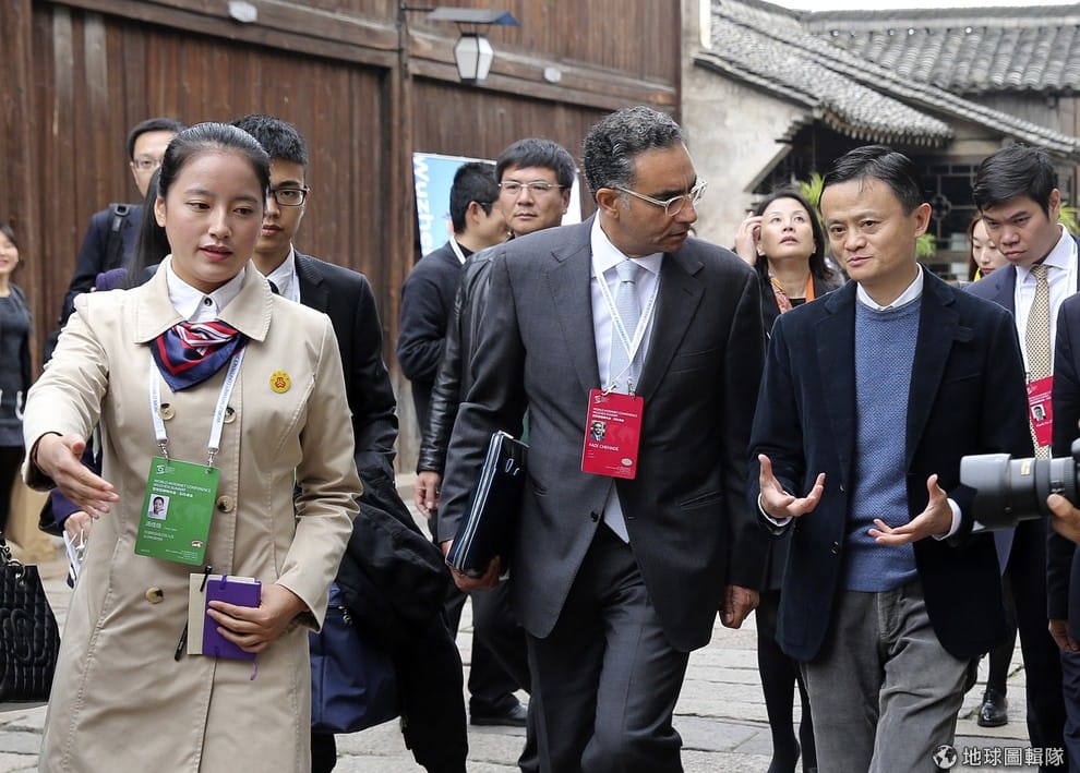 照片中胸前掛著紅吊牌的人是「網際網路名稱與號碼指配組織」(ICANN)總裁暨執行長切哈德(Fadi Chehadé),他與阿里巴巴的創辦人馬雲正在談話。
