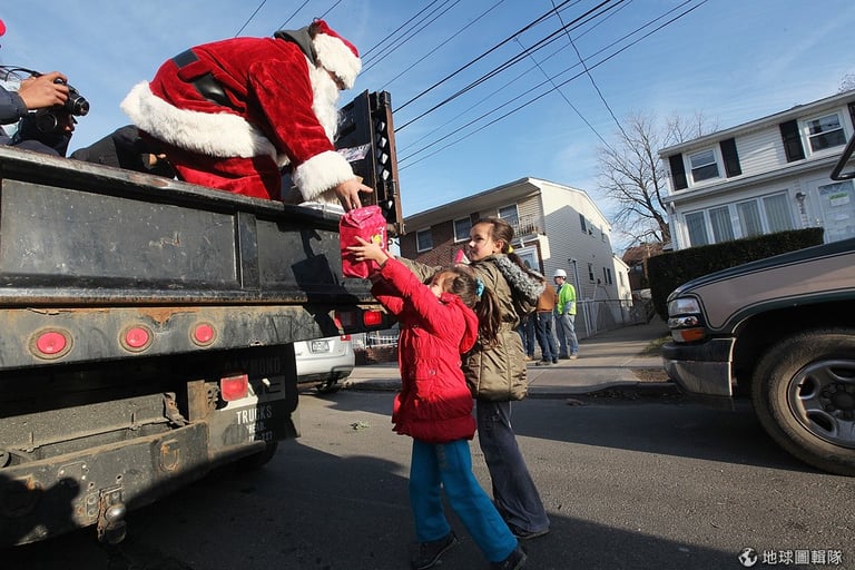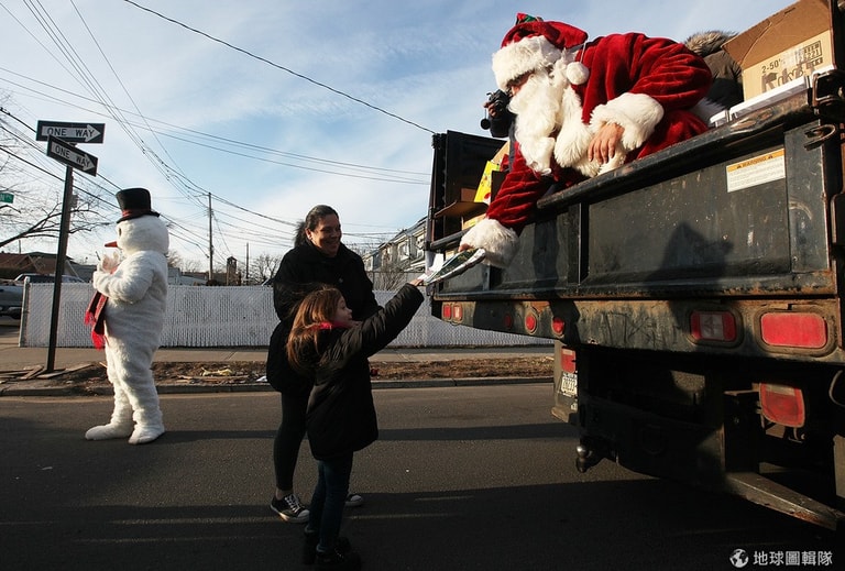 紐約州居民因為颶風「珊迪」的侵襲,失去家園。當地有人自願性地當起聖誕老公公,在災區巡迴發送愛心禮物給小朋友,一旁的雪人也好可愛啊。圖片來源:Mario Tama/Getty Images