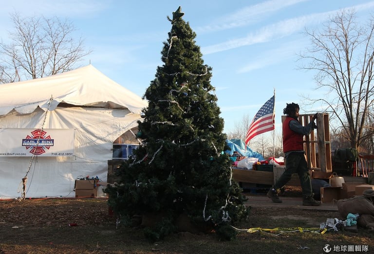 民眾在臨時居住的帳篷旁邊放了大大的聖誕樹,希望聖誕燈火能為大家添一絲心頭暖意。圖片來源:Mario Tama/Getty Images