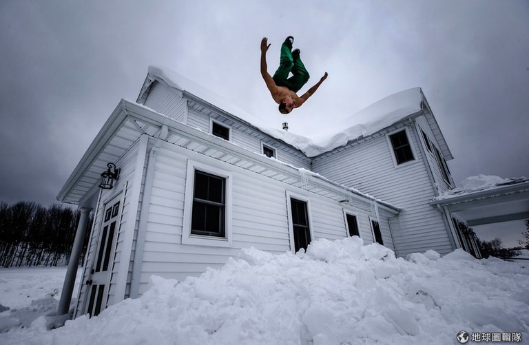 民眾趁著室外有厚重積雪,乾脆在自家屋頂上玩起後空翻。21號開始,紐約州的冰凍天氣開始轉暖,當地現在要擔憂的是冰融後的淹水問題。
