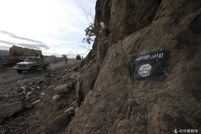 拉達(Rada)的山區,可以見到葉門的反政府組織胡西(Houthi)成員開車進入山區,山壁上可以見到「伊斯蘭教法虔信者組織」的旗幟,這裡是他們的大本營。