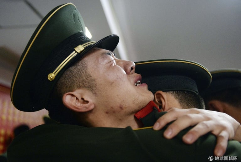 上海的一場退役軍官酒席上,將退伍的衛兵和同袍相擁而泣。