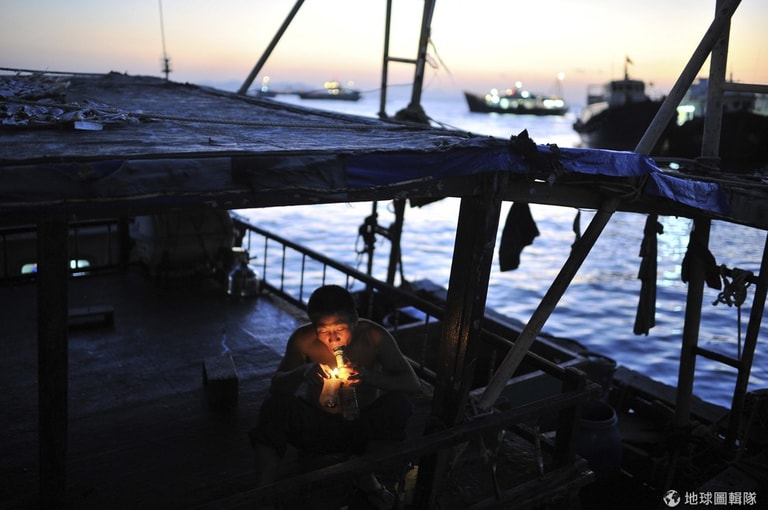 廣東省珠海東邊的「外伶仃島」上,可以見到一位漁民在夜色中點起菸。