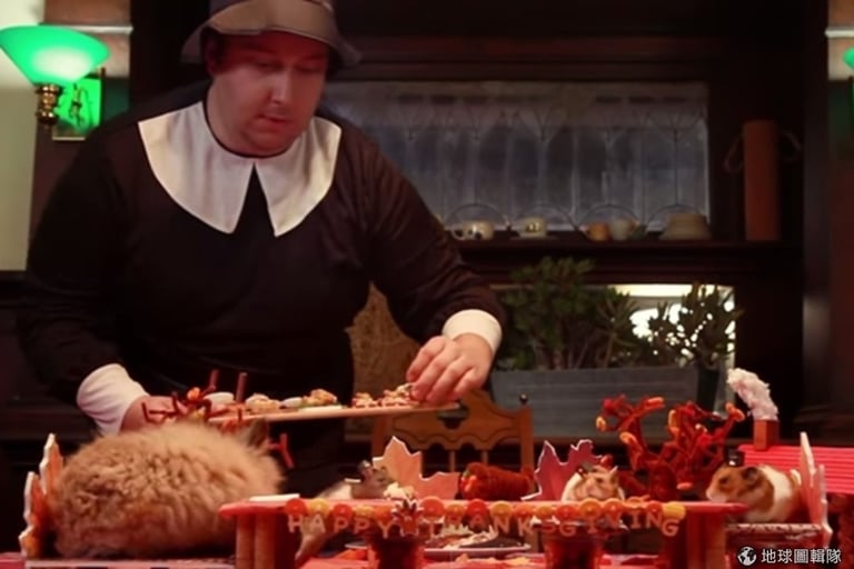 小倉鼠的感恩節大餐有麵包、南瓜派、火雞肉等,廚師小心翼翼地切分,將迷你餐點放到餐盤上,一切大功告成的時候,小倉鼠和兔子早就在布置好的「餐廳」等著廚師上菜。終於,食物一道道來到牠們眼前,看著小動物吃得津津有味,廚師也鬆了口氣、滿意地點頭。