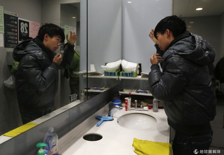 剛起床的黃之鋒到公共廁所中梳洗