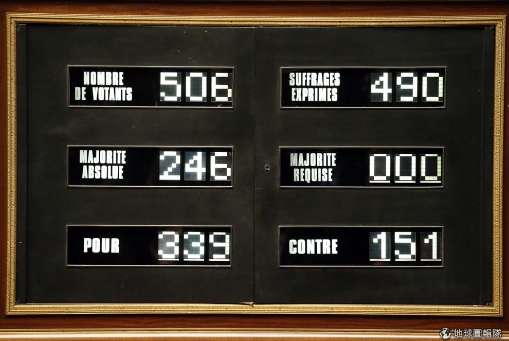 法國國會的電子看板顯示,有339名議員贊成巴勒斯坦是個國家,151人反對。