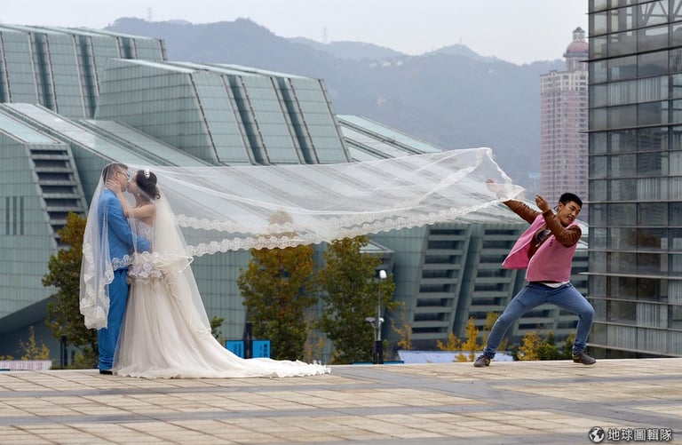 重慶市當地,一對新人正在拍攝婚紗照,旁邊的攝影助理則忙碌地想把新娘婚紗拉起做出飄逸效果。