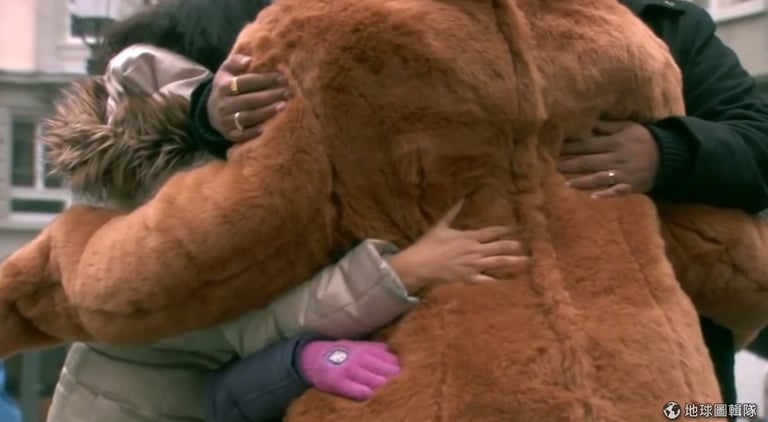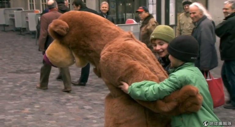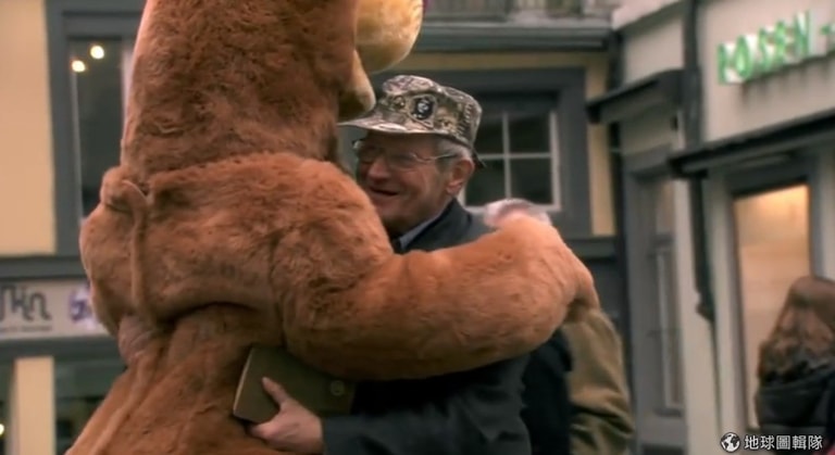 然而,故事的最後,大熊還有話想說。原來,大熊是一位身心障礙者 Fabian 所扮演,對他來說,擁抱是一件很不簡單的事,「人們不會對我不友善,但是大家不會想要靠近我。」