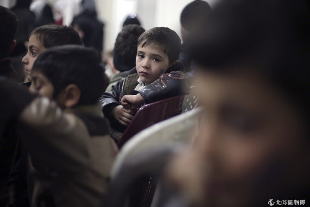 小男生失神地看向遠處,敘利亞大馬士革附近的多馬(Douma)有慈善組織把失去家人的孤兒們聚集在一起。