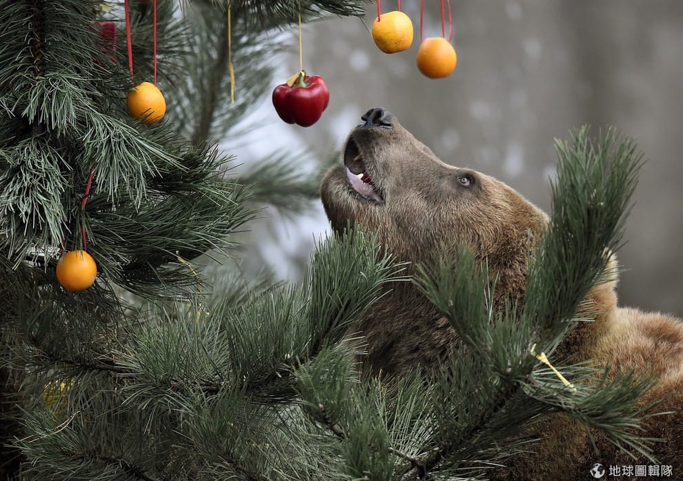 漢堡的哈根貝克動物園(Hagenbecks zoo)中,堪察加棕熊瑪斯查(Mascha)好奇地看著園方替他準備的聖誕樹。