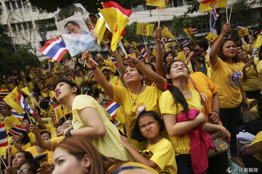 民眾開心地揮舞旗幟,他們在12月5日這天要替泰皇蒲美蓬(King Bhumibol Adulyadej)慶祝87歲生日,但泰皇因為健康問題近年來頻頻入院,今年他得在醫院休養過生日。