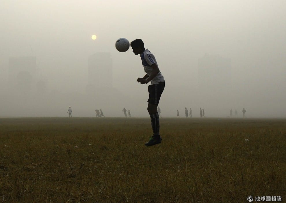 加爾各答當地,一位民眾在霧氣未散的清晨努力練習踢足球。