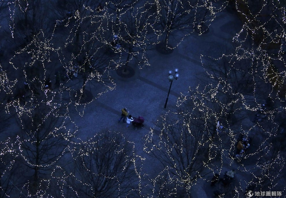 布拉格市區內,民眾走過點上聖誕燈光的街道。