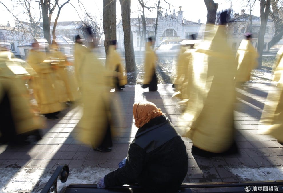 俄國的斯塔夫羅波爾(Stavropol)市區內,一名婦人坐在長凳上看著眼前魚貫走過的朝拜人龍。