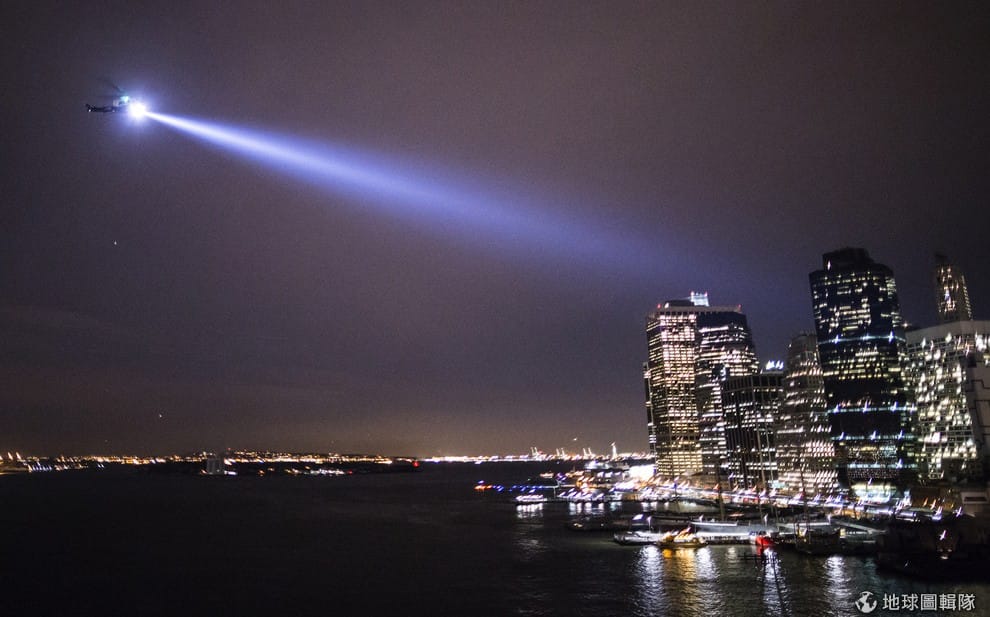 紐約警察部門出動直升機巡邏,直升機燈光投射向正在不斷示威抗議的群眾。