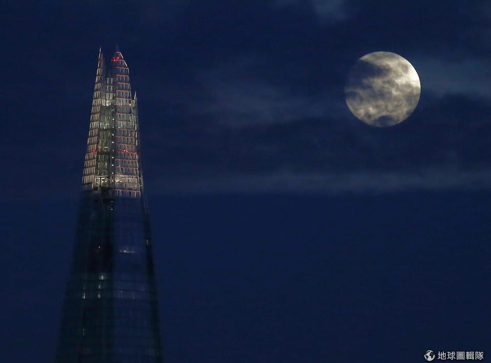 倫敦的夜空出現一輪滿月,一旁是歐洲第二高建築物碎片大廈(Shard)。