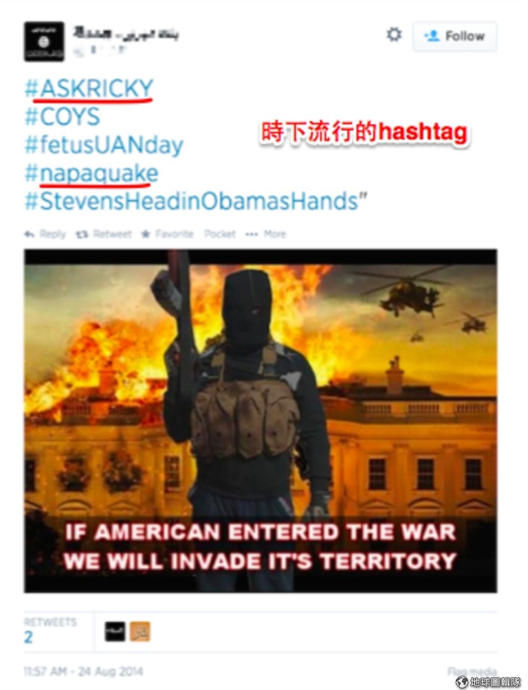 ISIS 利用生生不息的推特帳號播送殘忍的圖像和威脅警訊,其中包括許多美國傷者或逝去的士兵照片,此外,他們還會搜尋當時最流行的標籤,在發文時也標記上,以增加發文的傳播範圍。